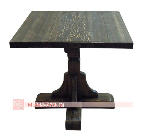 Это стол прямоугольный на одной ноге. Основание у него массивное, а значит, он устойчивый, не шатается и не переворачивается. Нога собрана из деталей с плавными формами, из-за чего столик кажется изящным и даже изысканным. Столешница простая на вид, не толстая, что тоже придает этому прямоугольному столу из массива визуальную легкость. Привлекает внимание фактура сосны, которая особенно эффектно смотрится после браширования и тонирования в темный цвет.