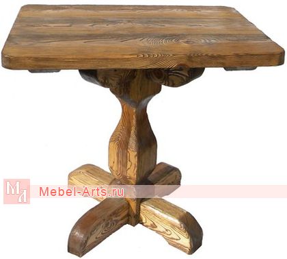 Стол под старину (из искусственно состаренной древесины). Деревянный стол с прямоугольной столешницей на одной ноге. Четко выражена текстура дерева.