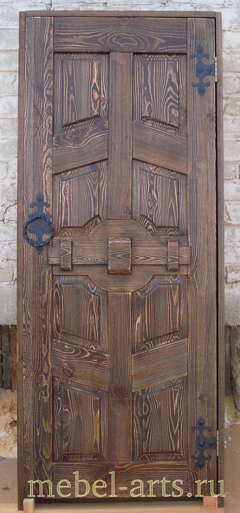 Дверь из массива с декоративными элементами, кованными петлями и ручкой